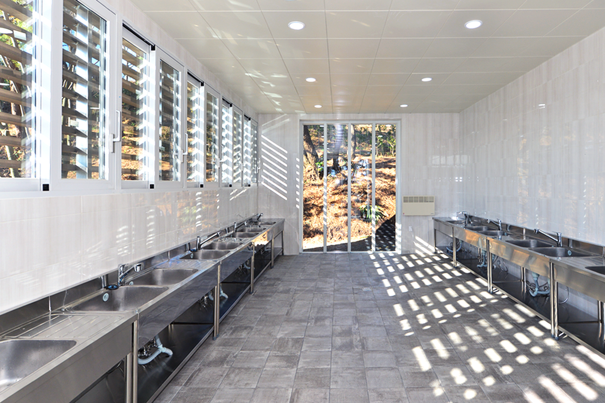모든 싱크대에서 온수가 콸콸 나오고, 간격도 넓어서 다른 사람들과 부딪힐 일이 없었어요. 중앙에는 전자레인지와 정수기까지 비치되어 있어 정말 편리했습니다. 화장실과 샤워실 역시 마찬가지로 청결 상태가 매우 훌륭해서 가족 모두가 만족하며 사용했답니다.